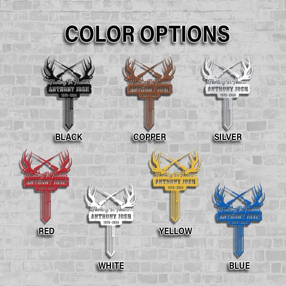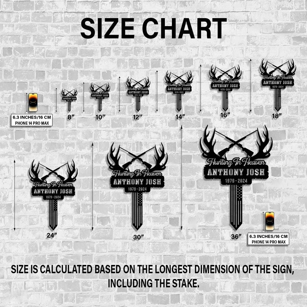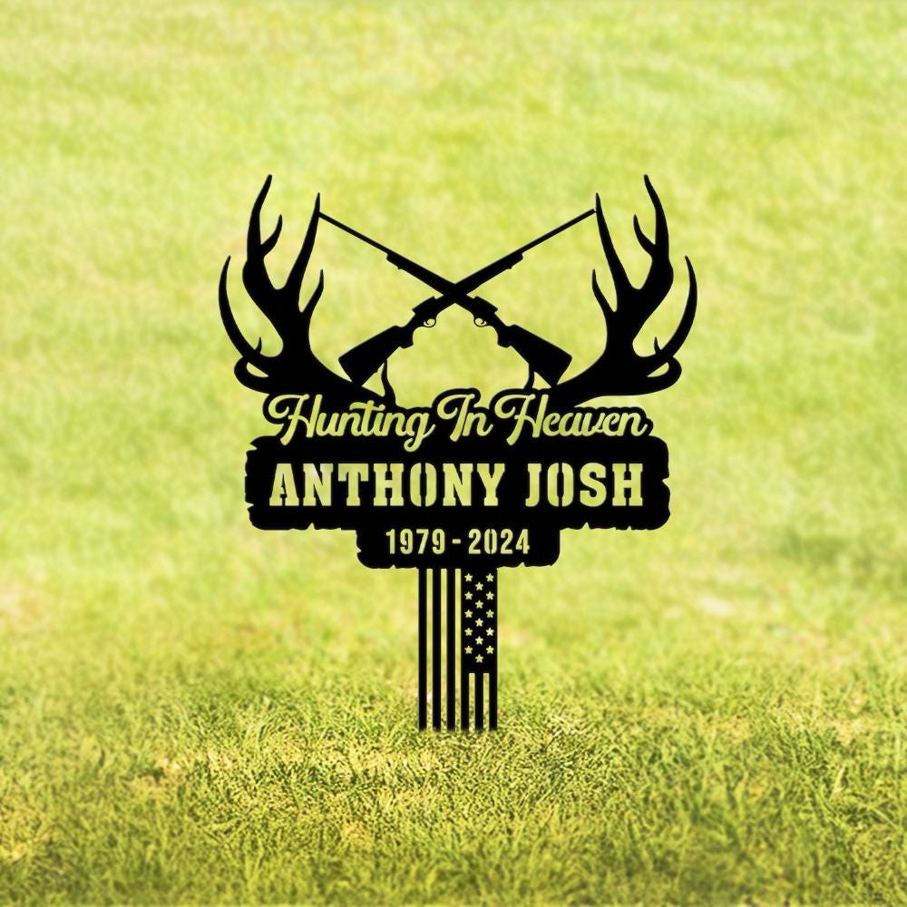 Hunting in Heaven, Custom Memorial Grave Marker, Metal Garden Stake Plaque, Loss of Dad Papa Husband, Deer Antlers and Rifle Tribute Sign
