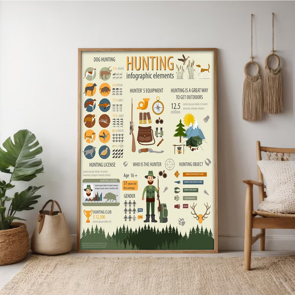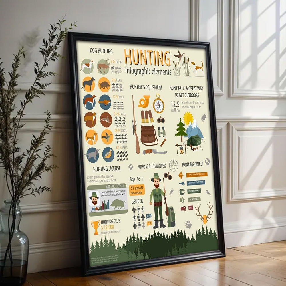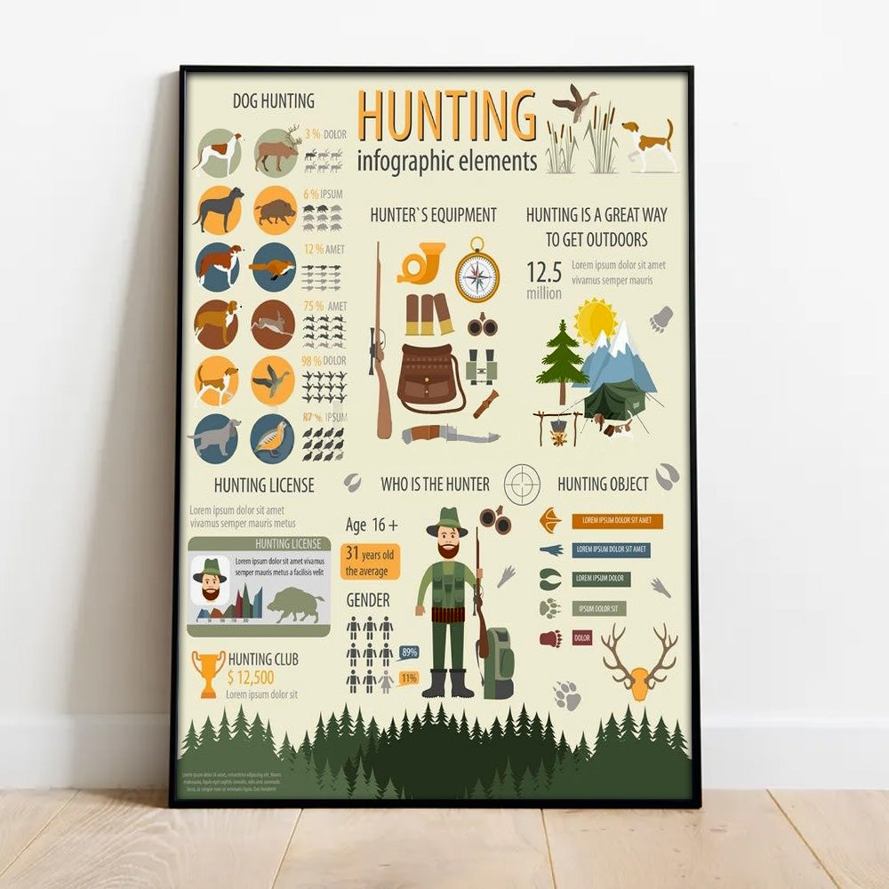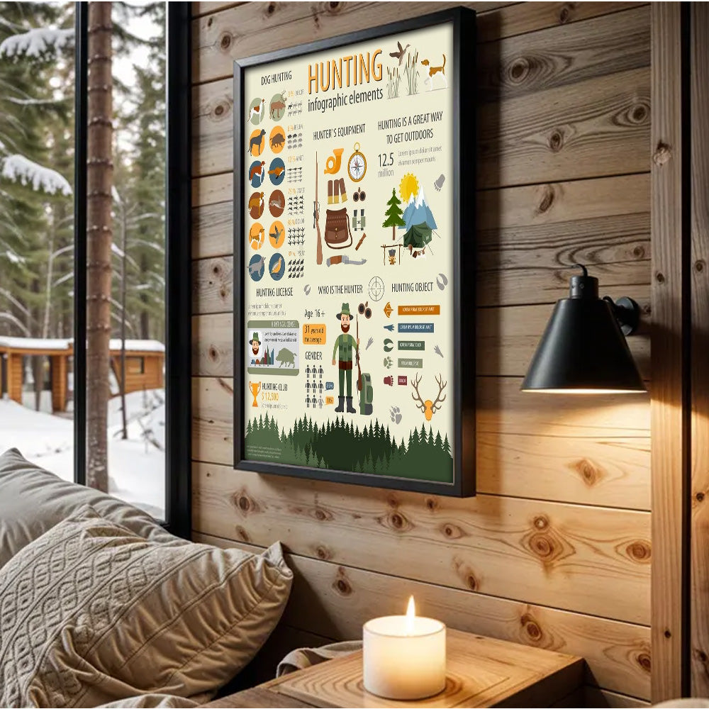 Hunting Infographic Poster – Dog Hunting, Gear & License Facts – Rustic Cabin Wall Art for Hunters