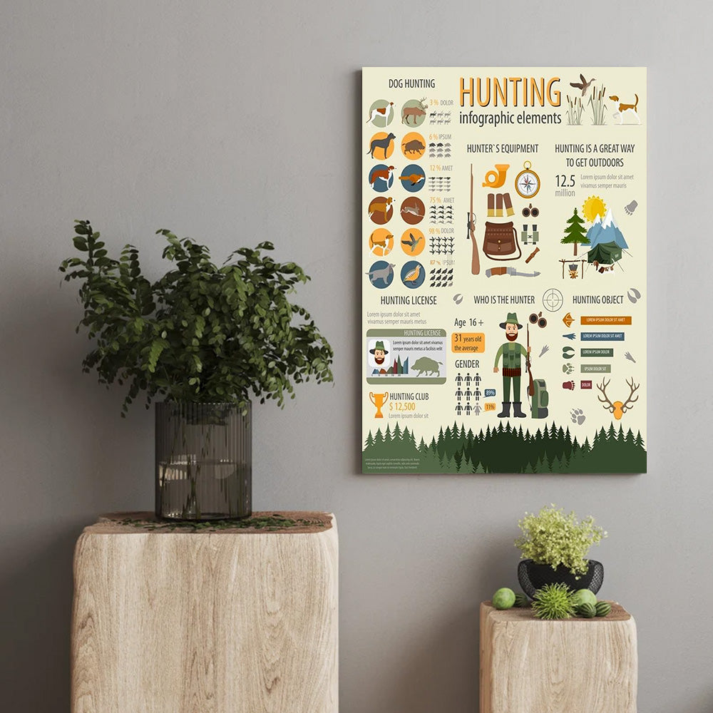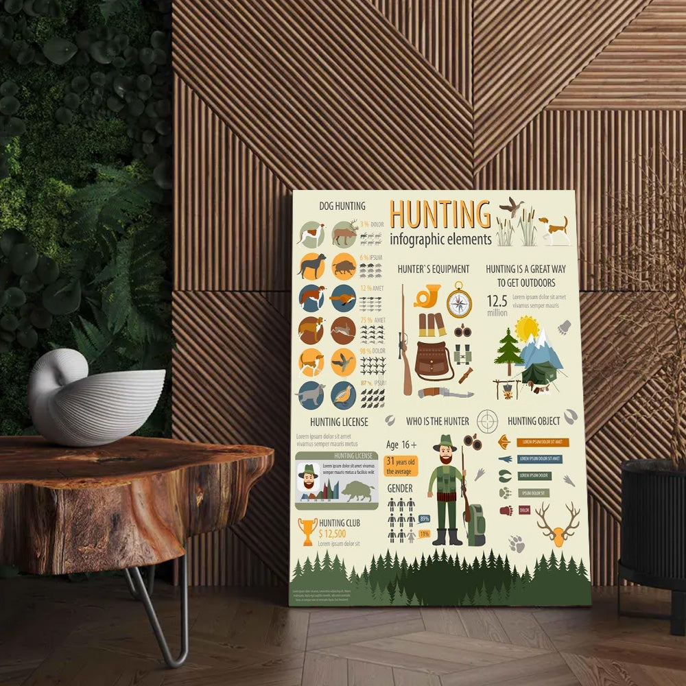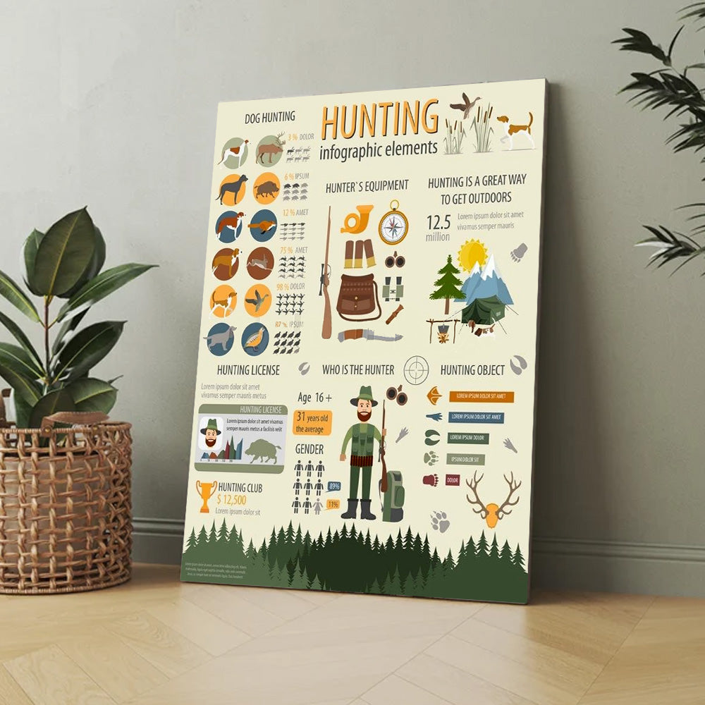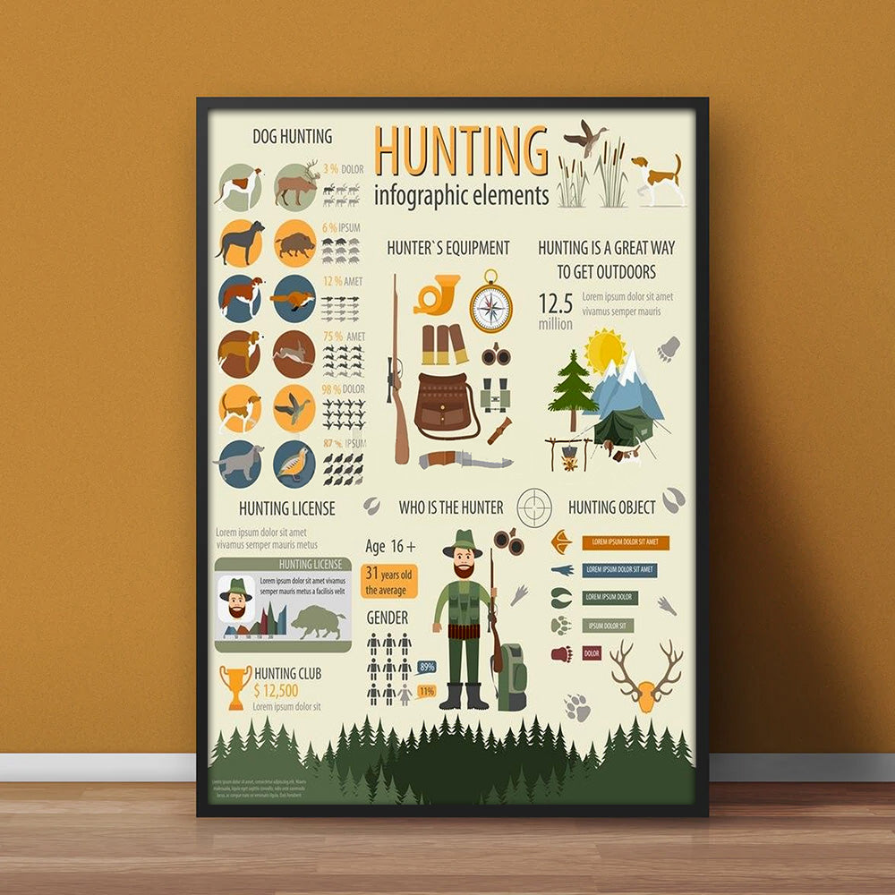 Hunting Infographic Poster – Dog Hunting, Gear & License Facts – Rustic Cabin Wall Art for Hunters