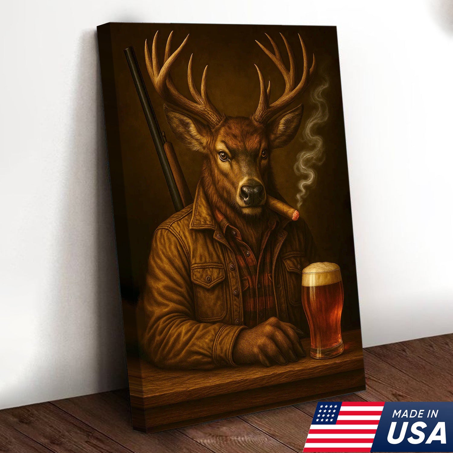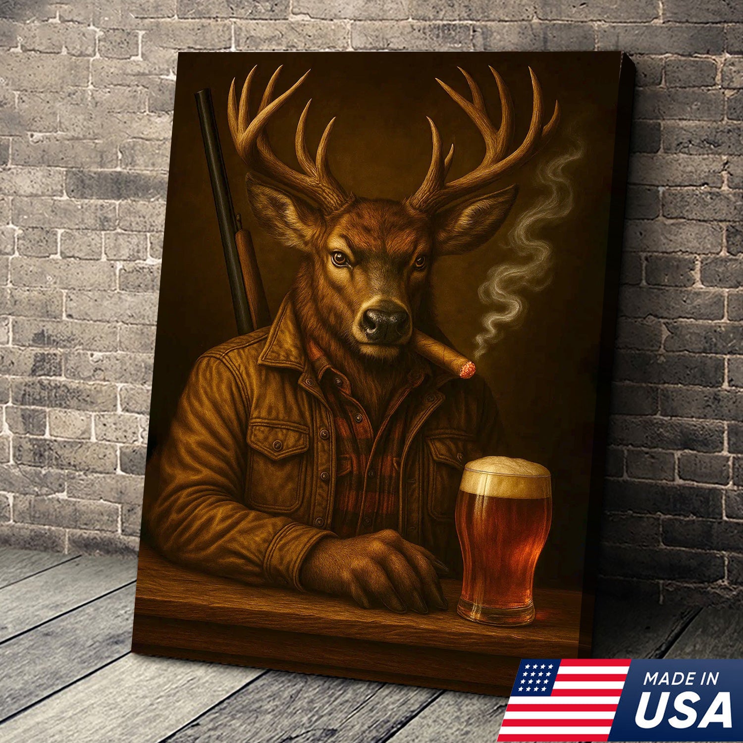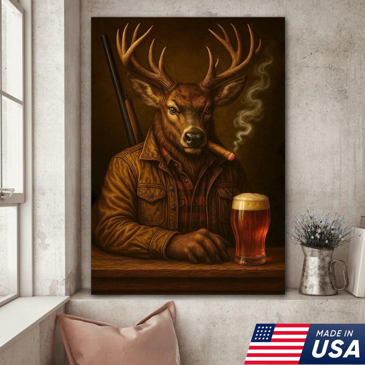 Majestic Deer Canvas Wall Art – Surreal Hunter Portrait with Beer Glass, Bold Rustic Decor