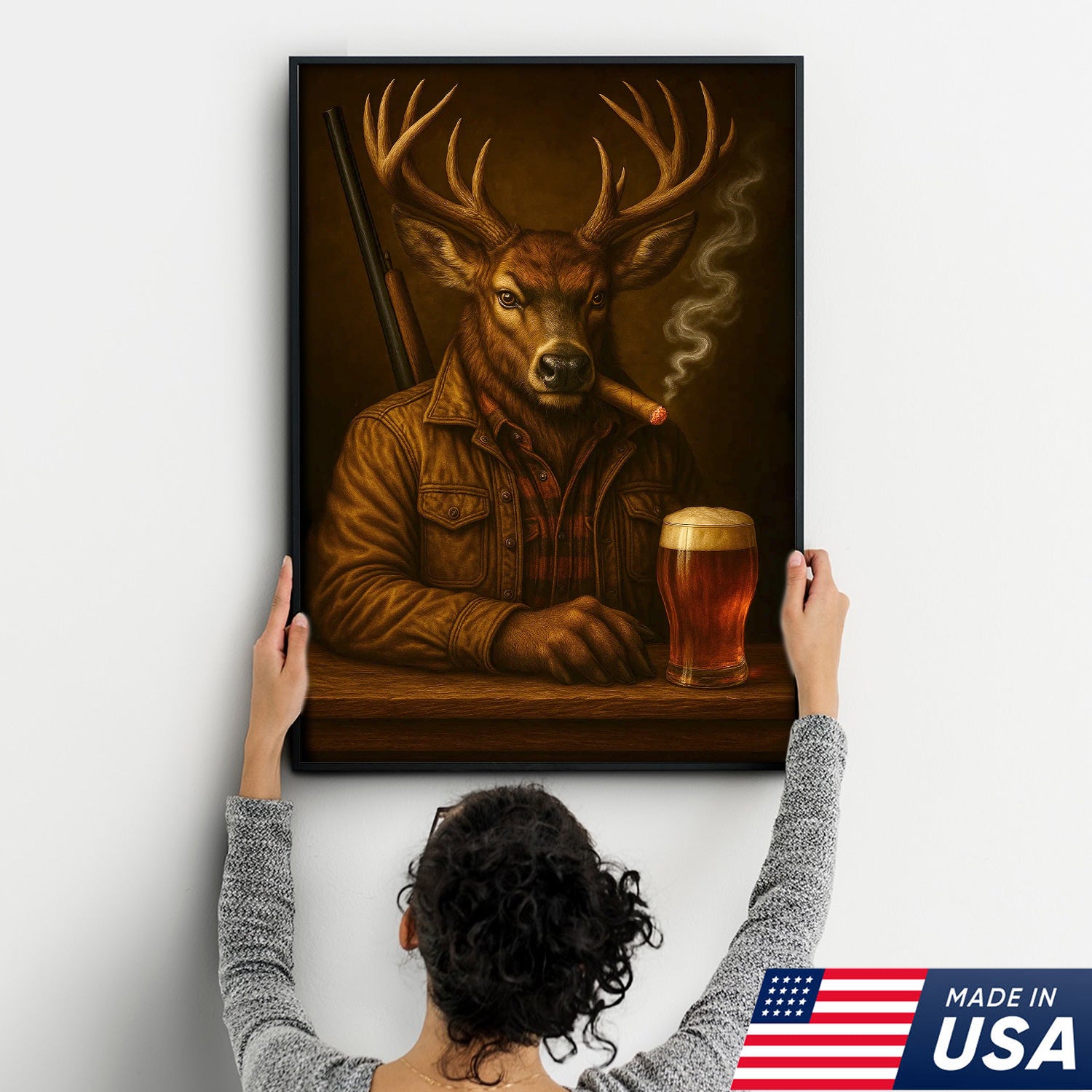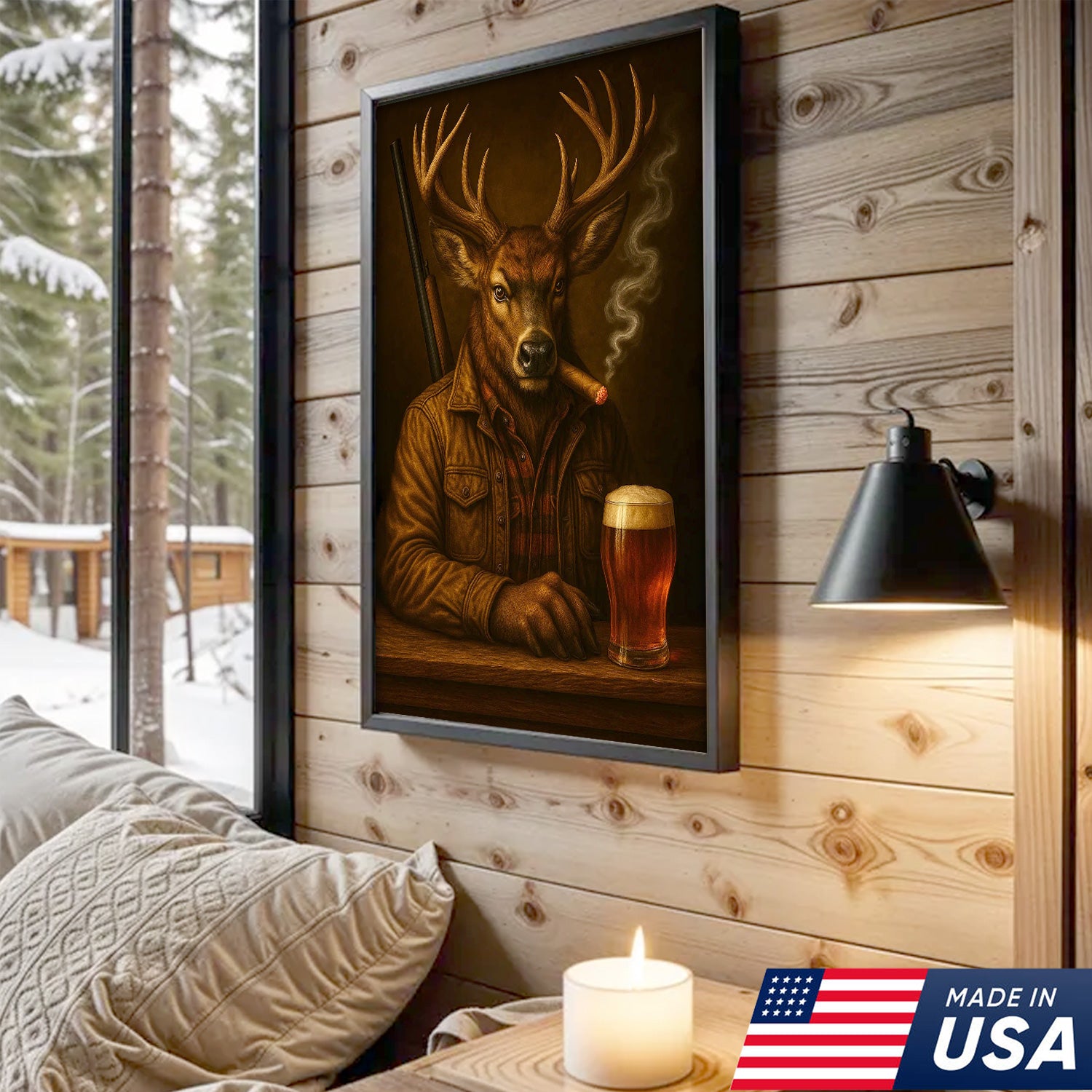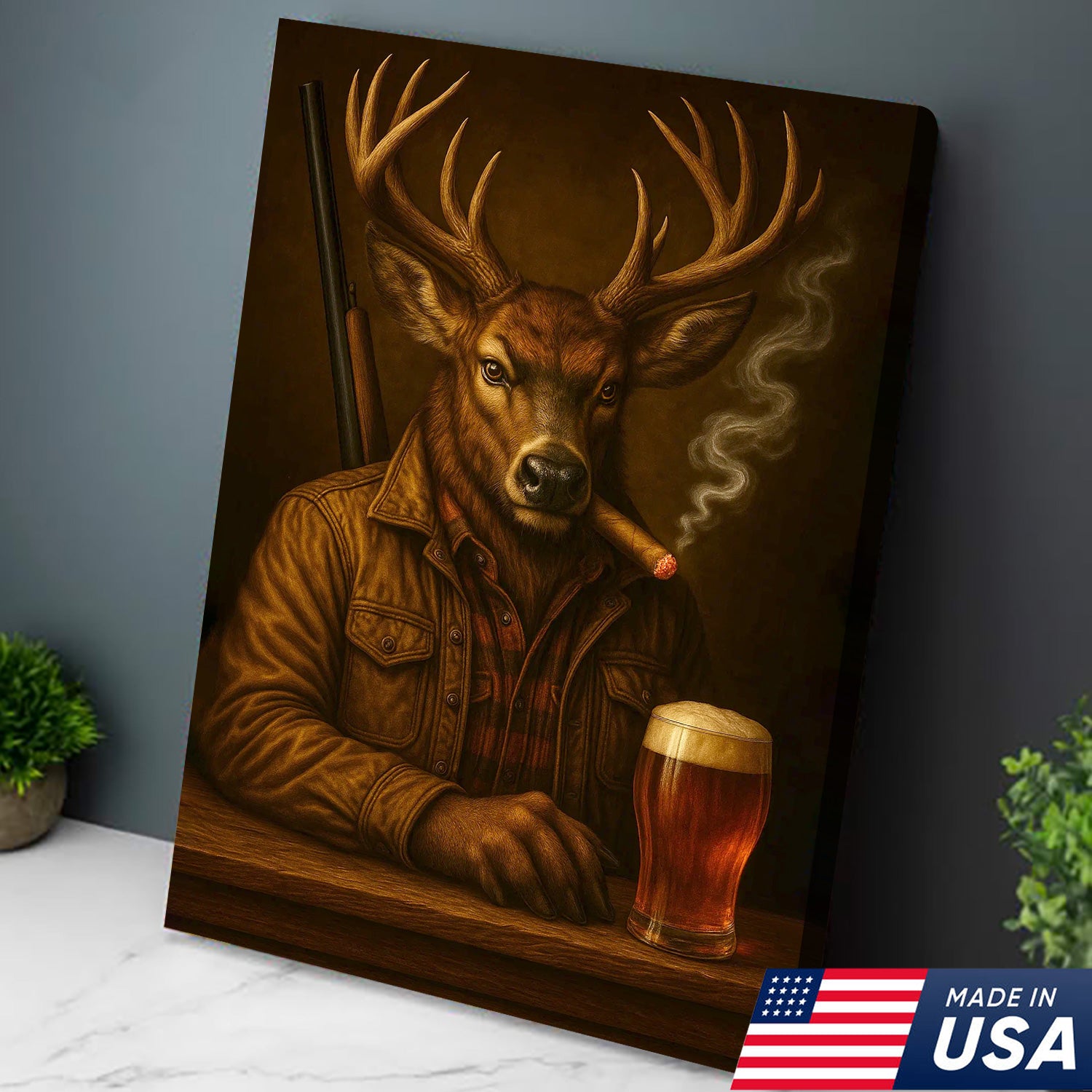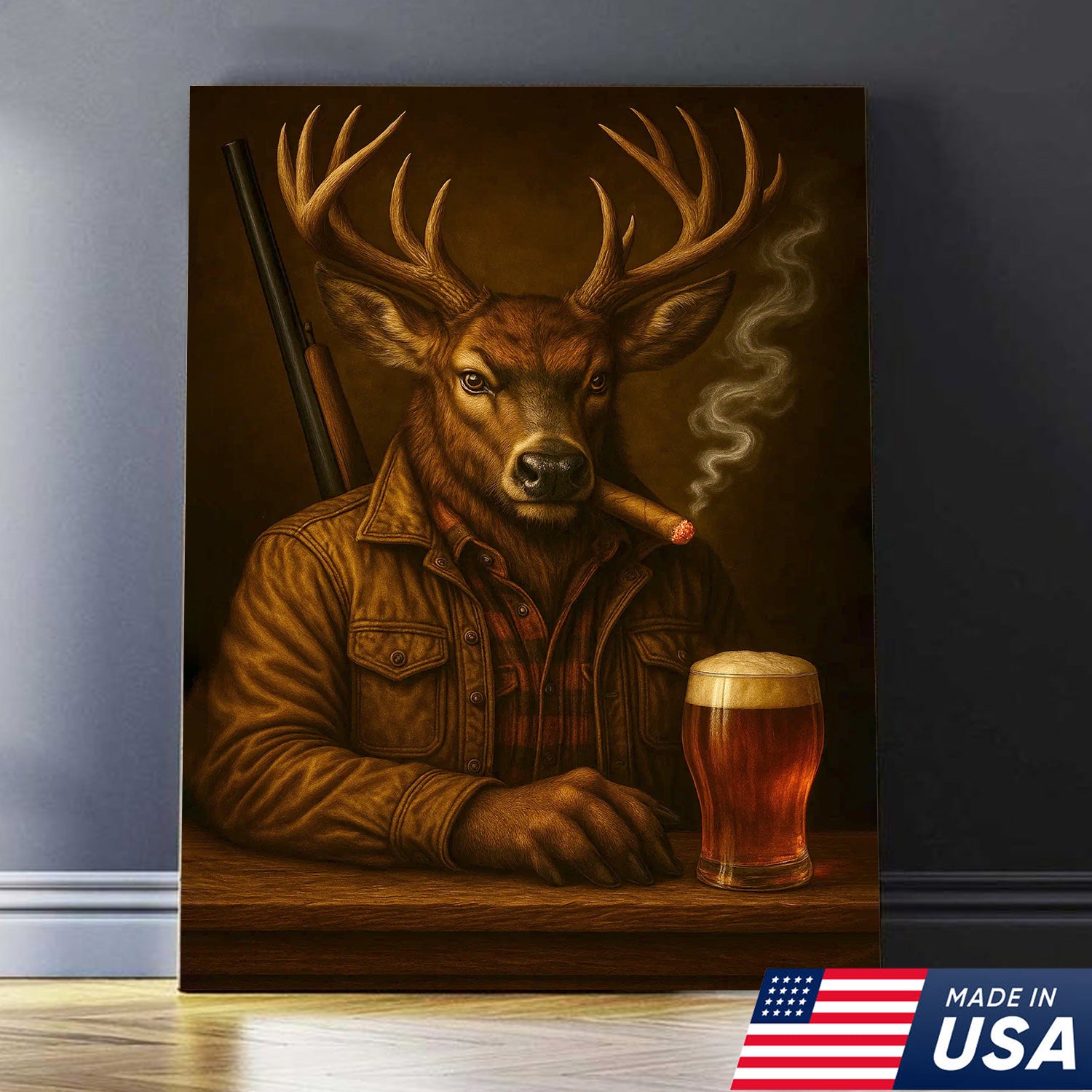 Majestic Deer Canvas Wall Art – Surreal Hunter Portrait with Beer Glass, Bold Rustic Decor