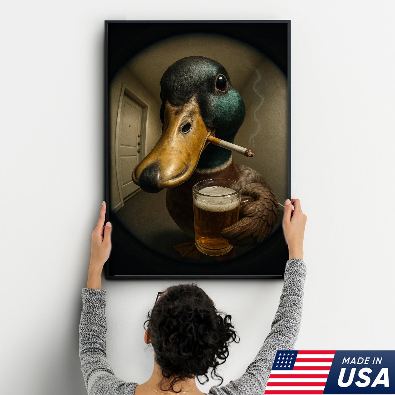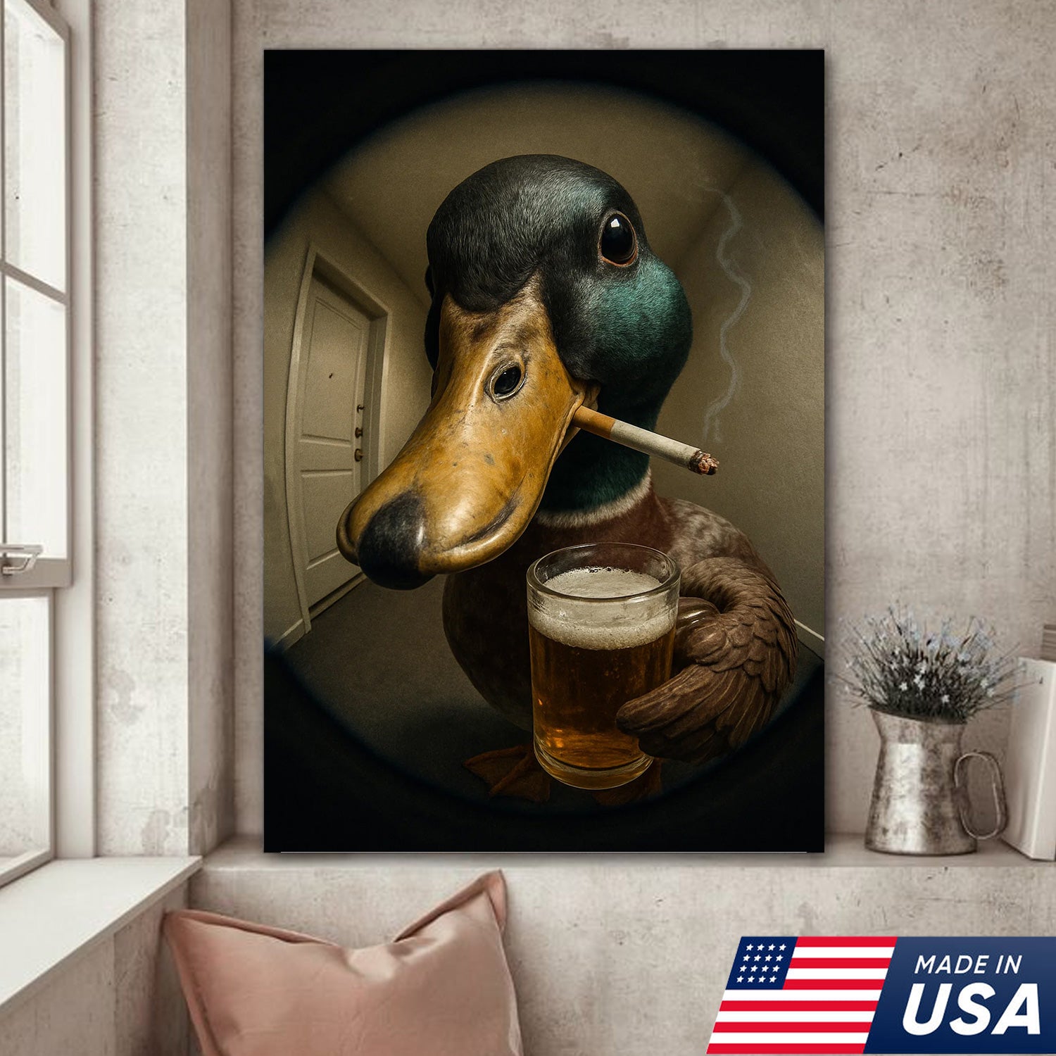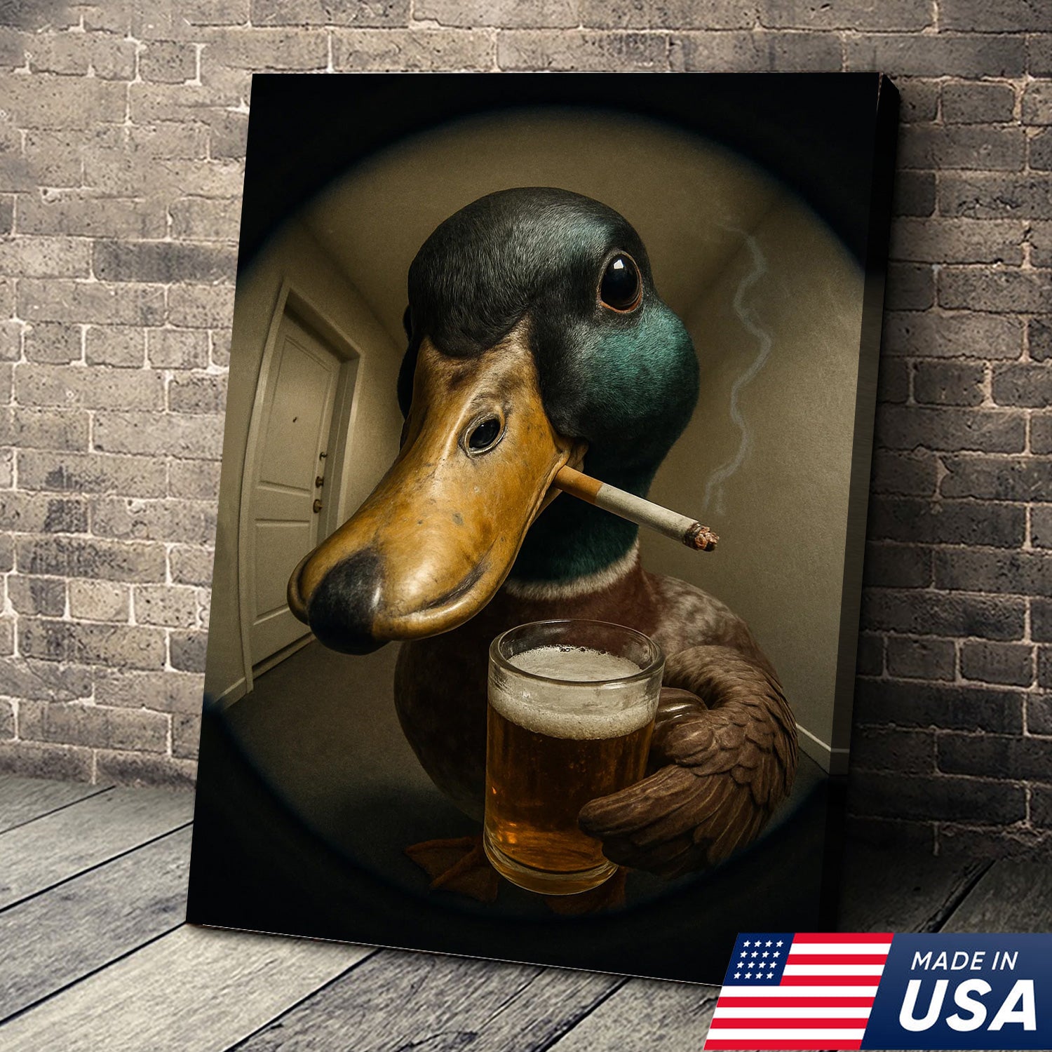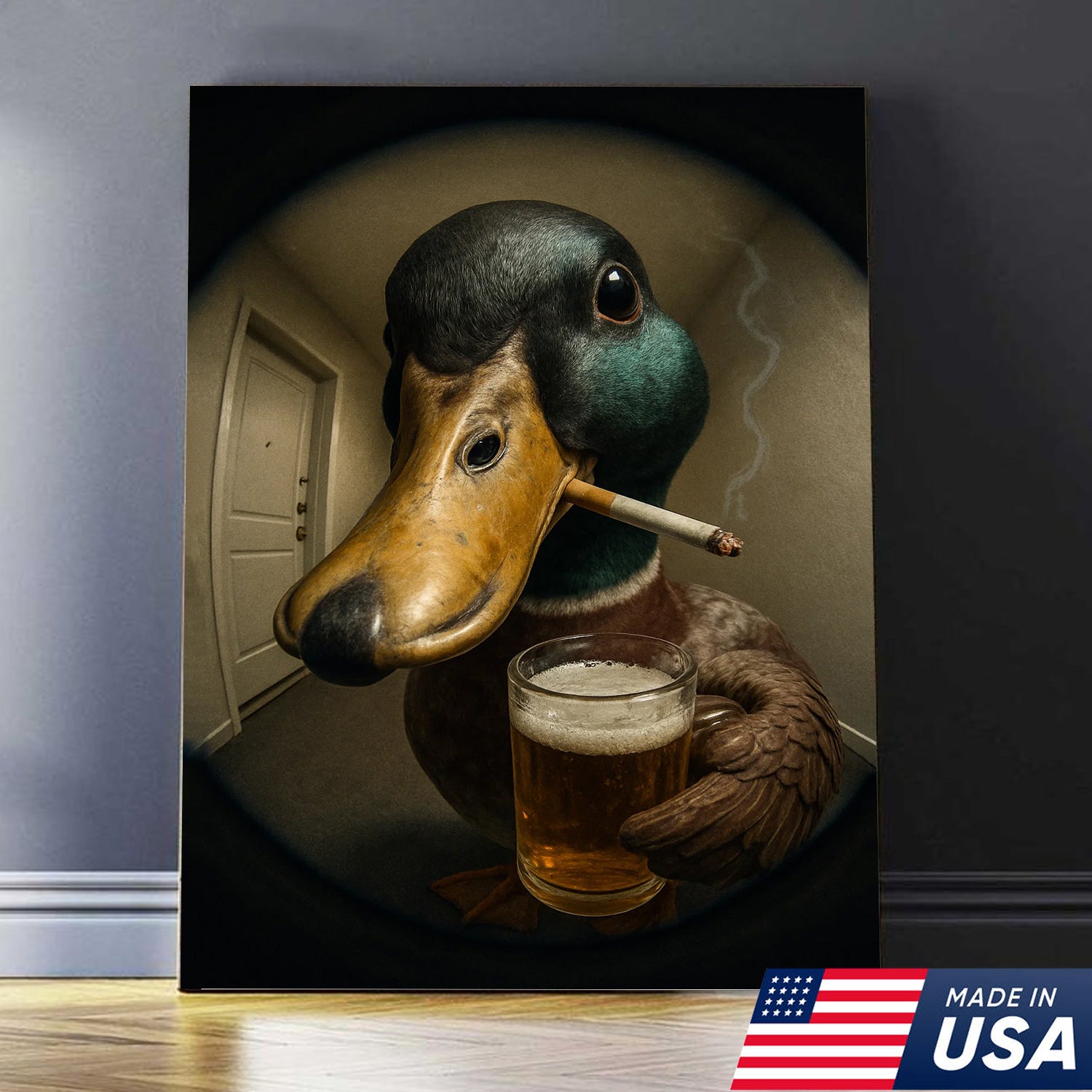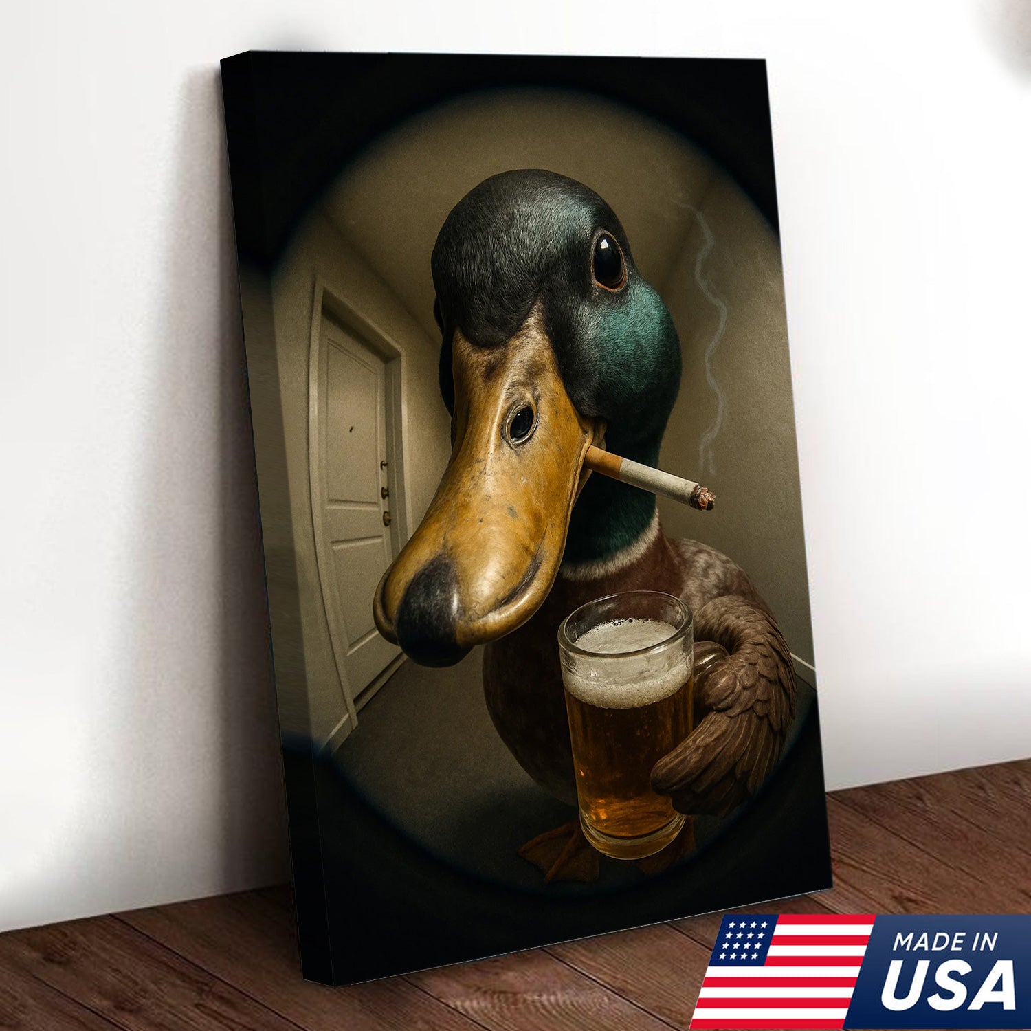 Mallard Duck Fisheye Canvas Wall Art – Funny Close-Up Door Peephole Portrait with Beer Glass– Quirky Duck Wall Decor