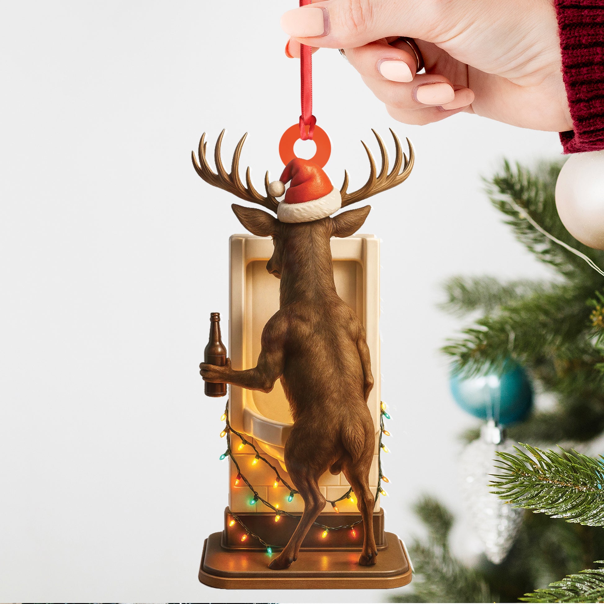 Personalized Acrylic Deer Christmas Ornament – Funny Buck with Santa Hat Drinking Beer by Urinal Holiday Decor
